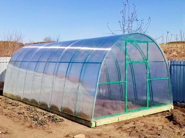 Теплица из профильной стальной трубы 20х20 с толщиной стенки металла 1 мм, изготовлена из цельных арок, каждая из которых усилена ребром жесткости. Шаг между дугами 1метр.